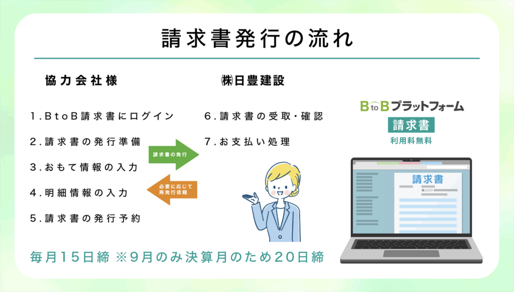 つきましては、弊社への請求書は「BtoBプラットフォーム請求書」を利用した電子請求書にて発行いただきますようご協力をお願い申し上げます。